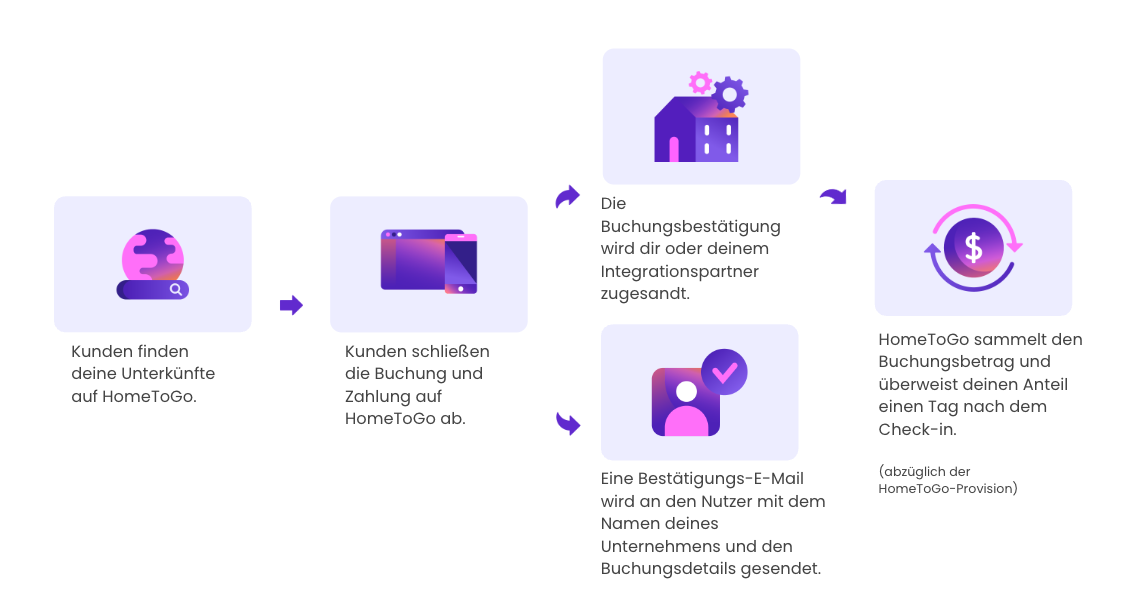 HomeToGo Payments verwendet einen einfachen und transparenten Auszahlungsprozess. Unser Zahlungsdienstleister sammelt die Zahlung; du erhältst deine Auszahlung für die Buchung einen Tag nach dem Check-in.